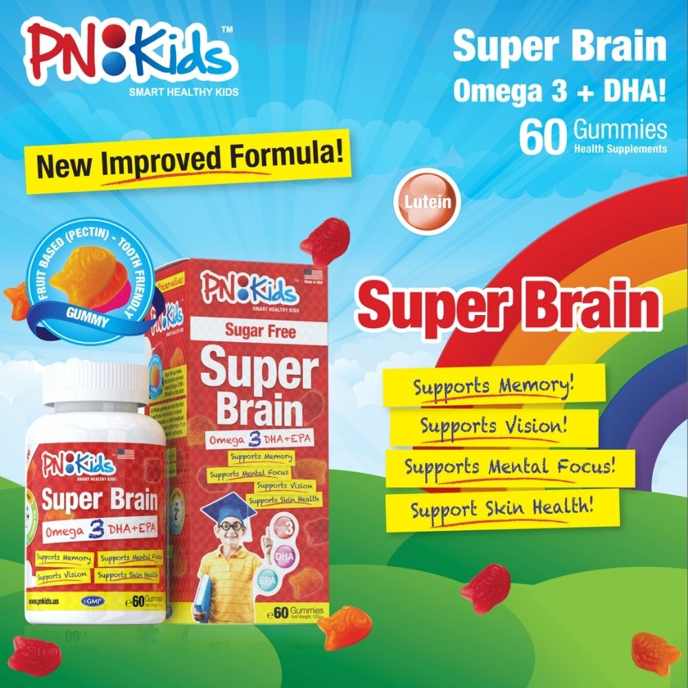 PNKids Super Brain is an improved version of Omega-3 DHA +EPA gummies with NO sugar coating. Sugar free gummies that contains premium natural Omega-3 DHA + EPA with no fishy taste. It helps to support brain development memory, vision, mental focus and skin health. All PNKids gummies are made from fruit based Pectin. Pectin helps to improve mineral absorption, is tooth friendly and its soft texture melts on the tongue.