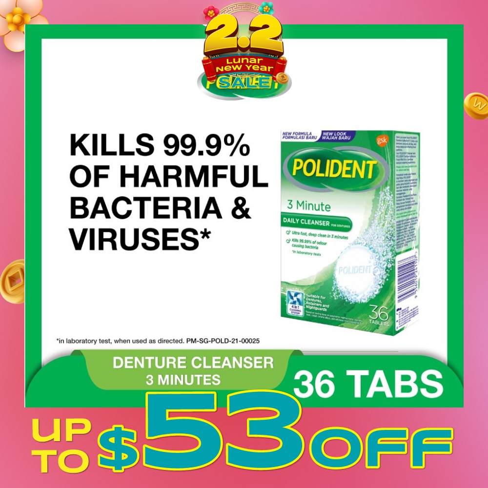 POLIDENT 3 Minutes Denture Care & Cleanser Tablet (Kills 99.99% Odour Causing Bacteria) 36s