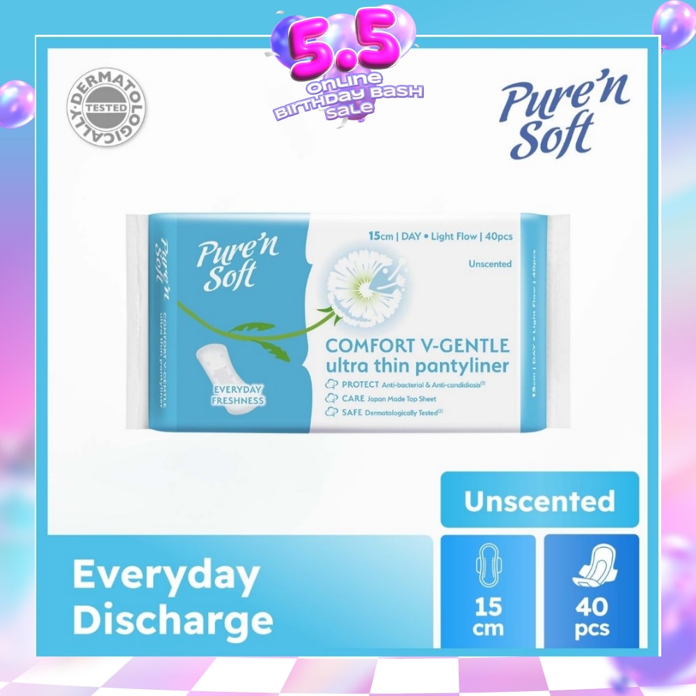 PURE N SOFT Comfort V-Gentle Ultra Thin Pantyliner Unscented 15cm (Anti-Bacterial, Anti-Candidiasis & Dermatologically Tested) 40s