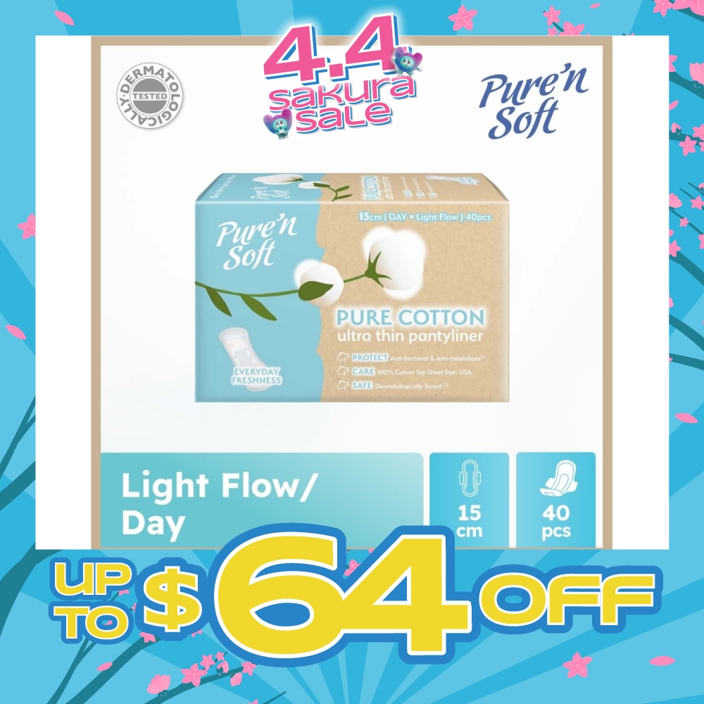 PURE N SOFT Pure Cotton Ultra Thin Pantyliner 15cm (Anti-Bacterial, Anti-Candidiasis & Dermatologically Tested) 40s