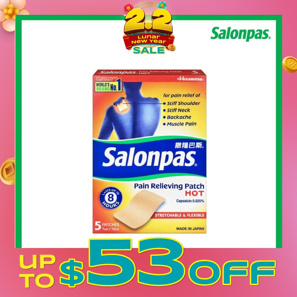 Salonpas® Pain Relieving Patch HOT 5s is Made in Japan. SALONPAS® PAIN RELIEF PATCH is thin, stretchable and flexible; skin tone color patch so it is not conspicuous. Sticks on firmly, yet is easy to peel off and has no greasy residue and leaves no mess. Hot sensation to relieve minor ache and improve blood circulation