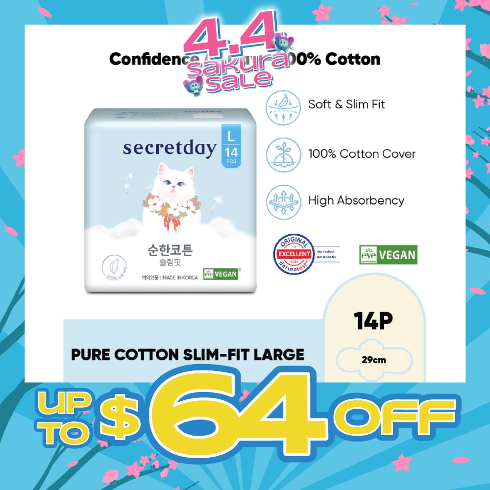 SECRET DAY Pure Cotton Slim-Fit Large (L) 29cm Sanitary Pad 14s