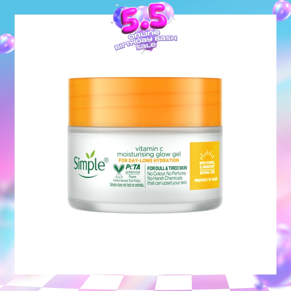 SIMPLE VITAMIN C MOISTURISING GLOW GEL 40g Simple Vitamin C Glow Moisturising Gel is proven to give 72hrs long hydration for soft, smooth, bright, and glowing skin. With exclusive skin conditioning agents and glycerine, this glow gel provides all day hydration to reveal brighter skin.