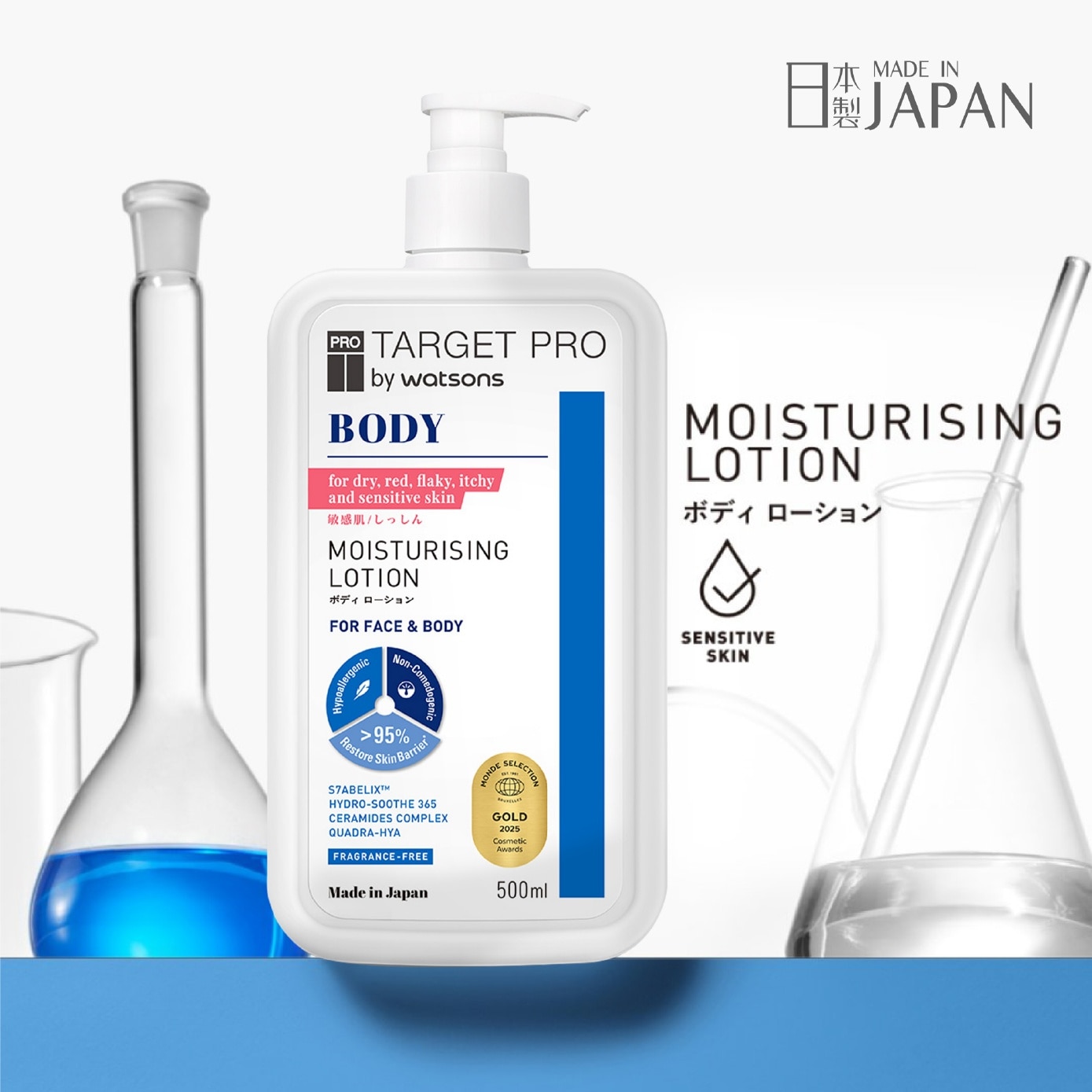 Target Pro by Watsons Body Care range seamlessly integrates the benefits of S7ABELIXTM, Hydro-Soothe 365, Ceramides Complex and Quadra-HYA with unique skin binding action to restore skin barrier and maintain the skin's moisture balance. Our formulation ensures a body care experience that speaks to the essence of purity. Free from parabens, mineral oil, colorants, and fragrances.