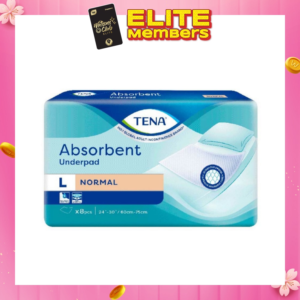 TENA Absorbent Underpad Size L is 60cm in length and 75cm in width, and comes in 8pcs per pack.