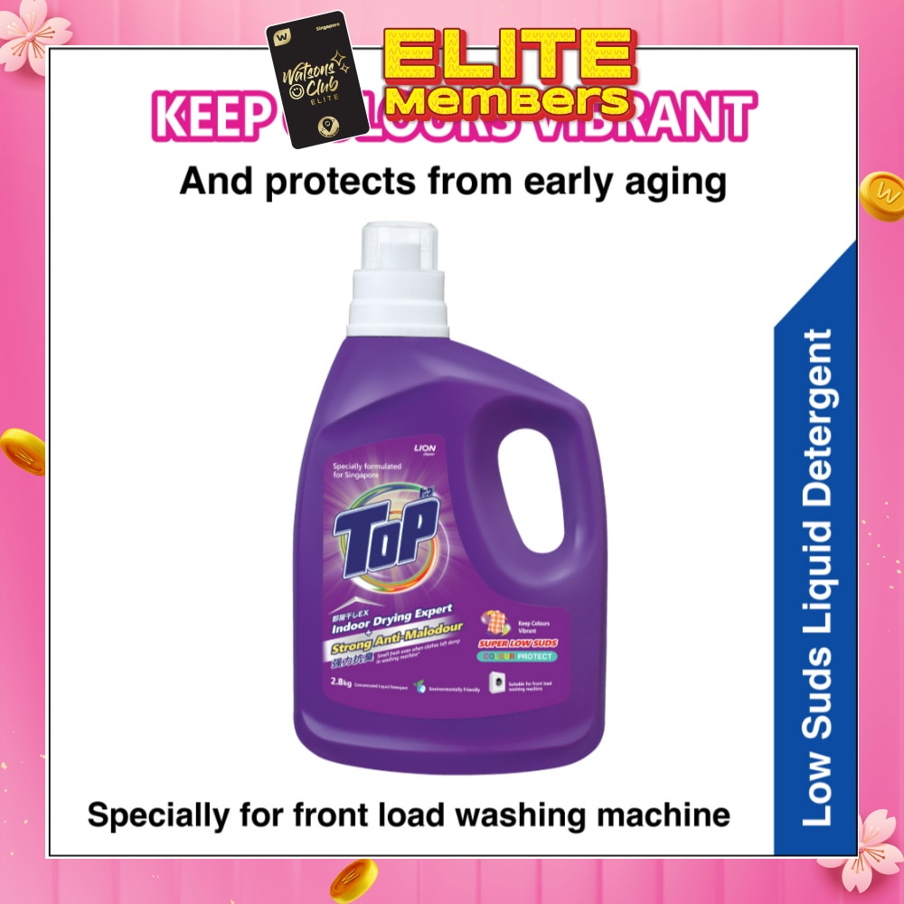 TOP Concentrated Liquid Detergent (Super Low Suds Colour Protect) is specially designed for front loading washing machines with low suds cleaning efficiency and is gentle on fabrics and drum. Using Lion Japan's advanced formula, it effectively removes 99.9% mite dust, stains and odours from your laundry, leaving it fresh and clean even when dried indoors. No more overnight soaking with TOP’s powerful cleaning performance. Keeps Colours vibrant and protects from early aging.