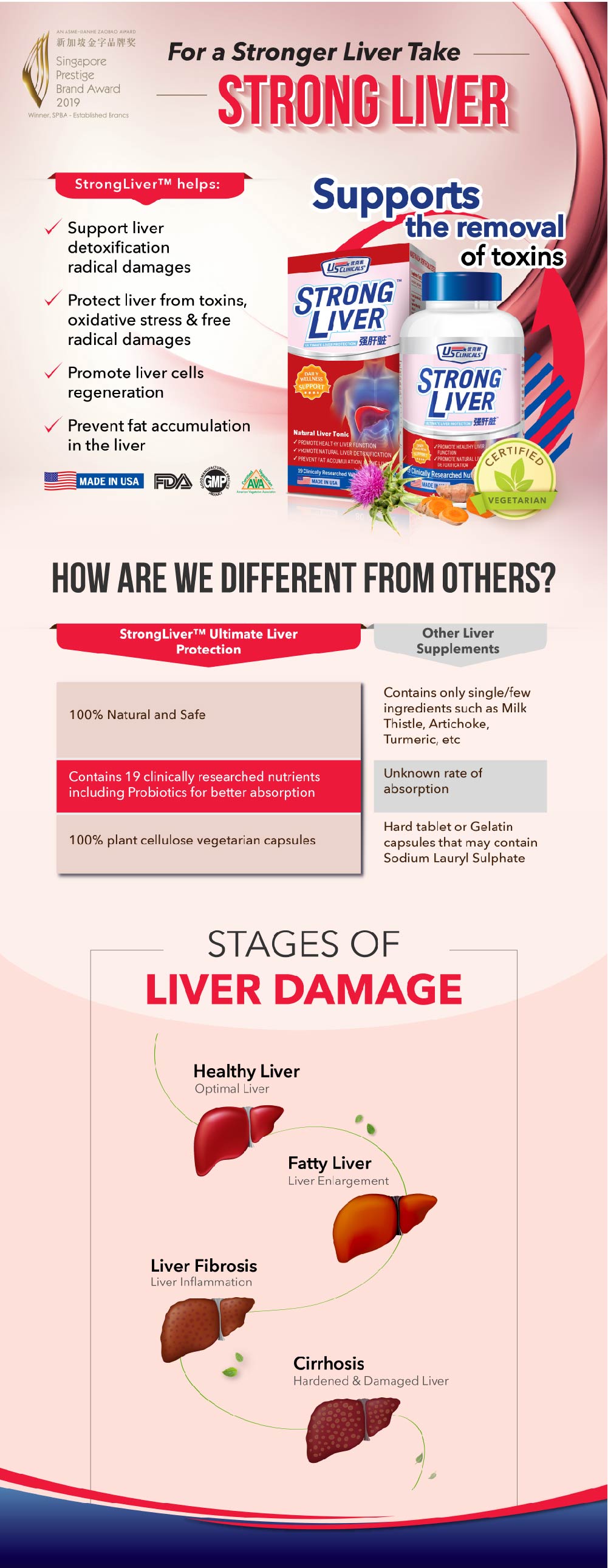 StrongLiver Ultimate Liver Protection is an antioxidant-rich, multi-nutrient advanced formula designed to promote healthy liver function and natural liver detoxification process. Scientifically formulated with 19 clinically researched nutrients, StrongLiver helps to stimulate the body’s natural ability to remove toxins and fat deposit; regulate secretion of bile; and promote the liver’s immunity as well as regenerating healthy liver cells essential for optimal liver function. StrongLiver protects your liver against harmful toxins and keeps you energized throughout the day.
