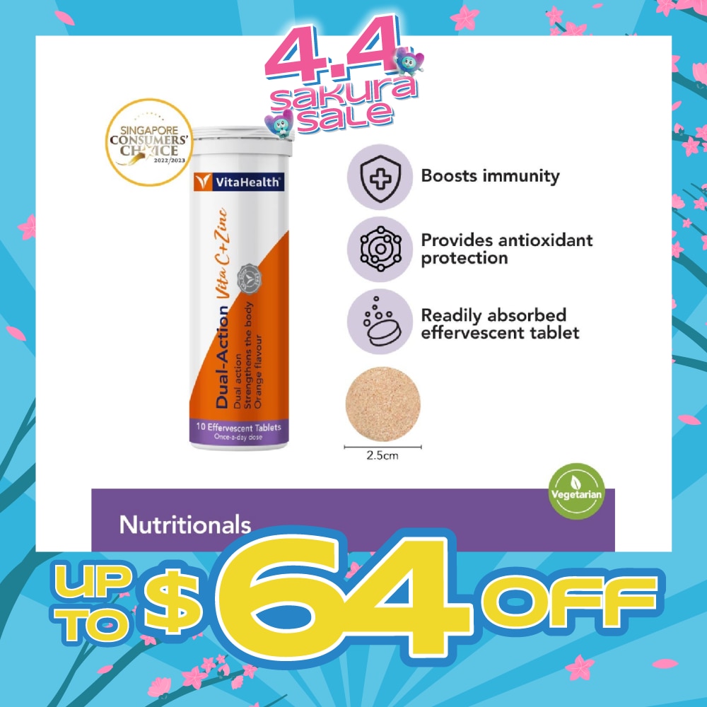 VITAHEALTH Dual-Action Vita C + Zinc Efferverscent Tablet Orange (Dual Action + Boost Immunity) 10s