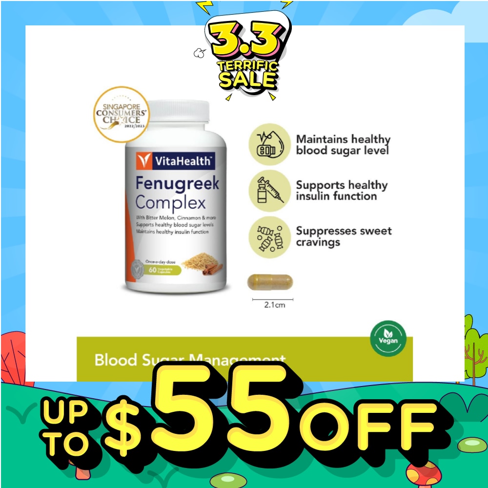 VitaHealth Fenugreek & Cinnamon Complex is a scientifically formulated blend of 6 natural herbs: Fenugreek, Bitter Melon, Gymnema Sylvestre, Cinnamon, Turmeric and Banaba Leaf specially designed to assist insulin function, glucose metabolism and support normal blood sugar levels.