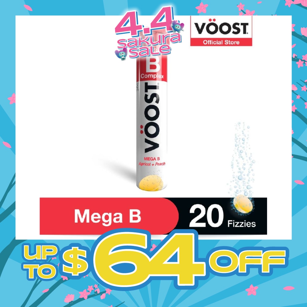 VOOST Mega B Complex Effervescent Vitamin Supplement Drop, Fizz and Enjoy! Sometimes, try as you might, life leaves you feeling flat. And, before you know it, youve lost your vibrancy, your fizz, your boost. What you need is your daily VOOST - a range of great tasting vitamin boost! VOOST Mega B Complex helps to relieve fatigue when dietary intake is inadequate, supports energy production, nervous system health, cognitive function and assist healthy red blood cell production Delicious apricot + peach flavour It has no added preservatives, dairy, lactose, soy or yeast and is vegan friendly too!