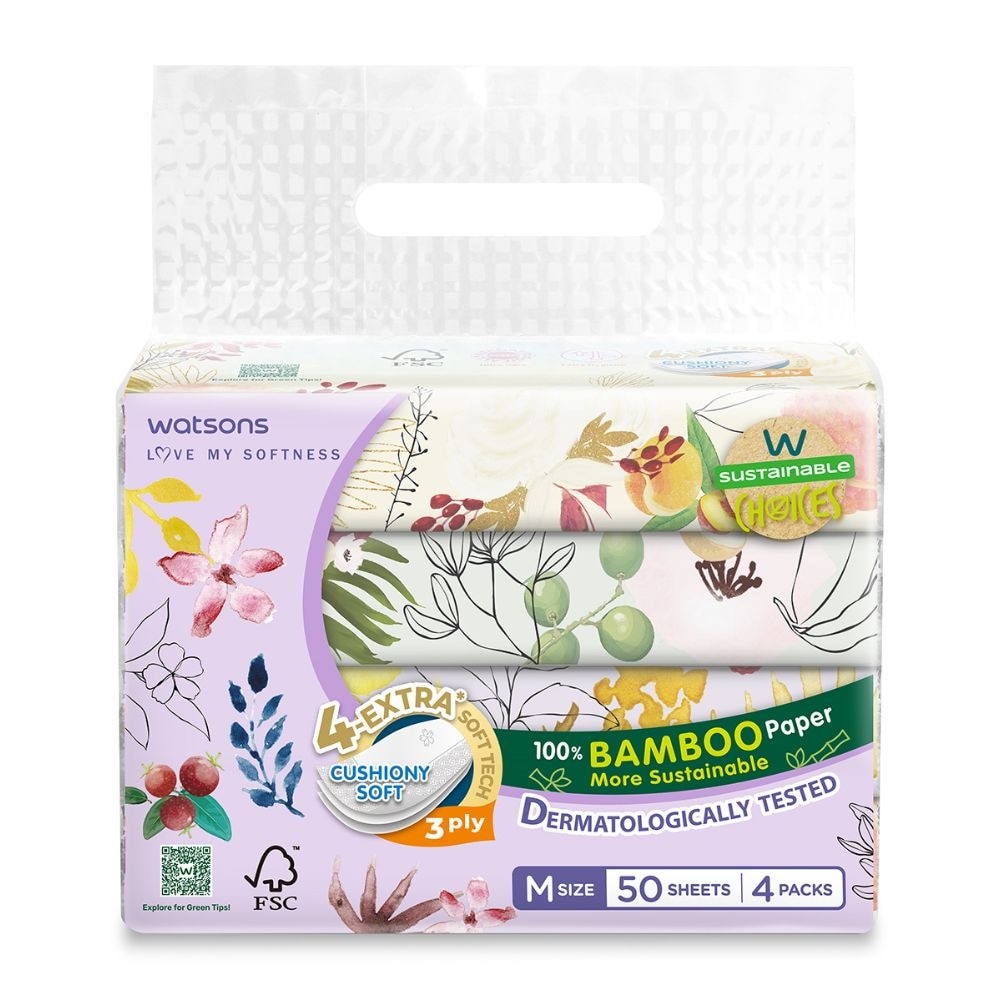 Watsons Tissue harnesses the power of 4-EXTRA SOFT-TECH, making it EXTRA SOFT, STRONG, ABSORBENT and SMOOTH for a richly cushioned feel. By using fast-growing, natural, unbleached bamboo pulp with FSC certification instead of wood pulp, we're contributing to sustainable forestry. We also guarantee that all tissues are dermatologically tested and proven safe for sensitive skin. Experience more sustainable luxury when you choose Watsons tissues, you're not just looking after yourself, but also our planet. Make the switch now!
