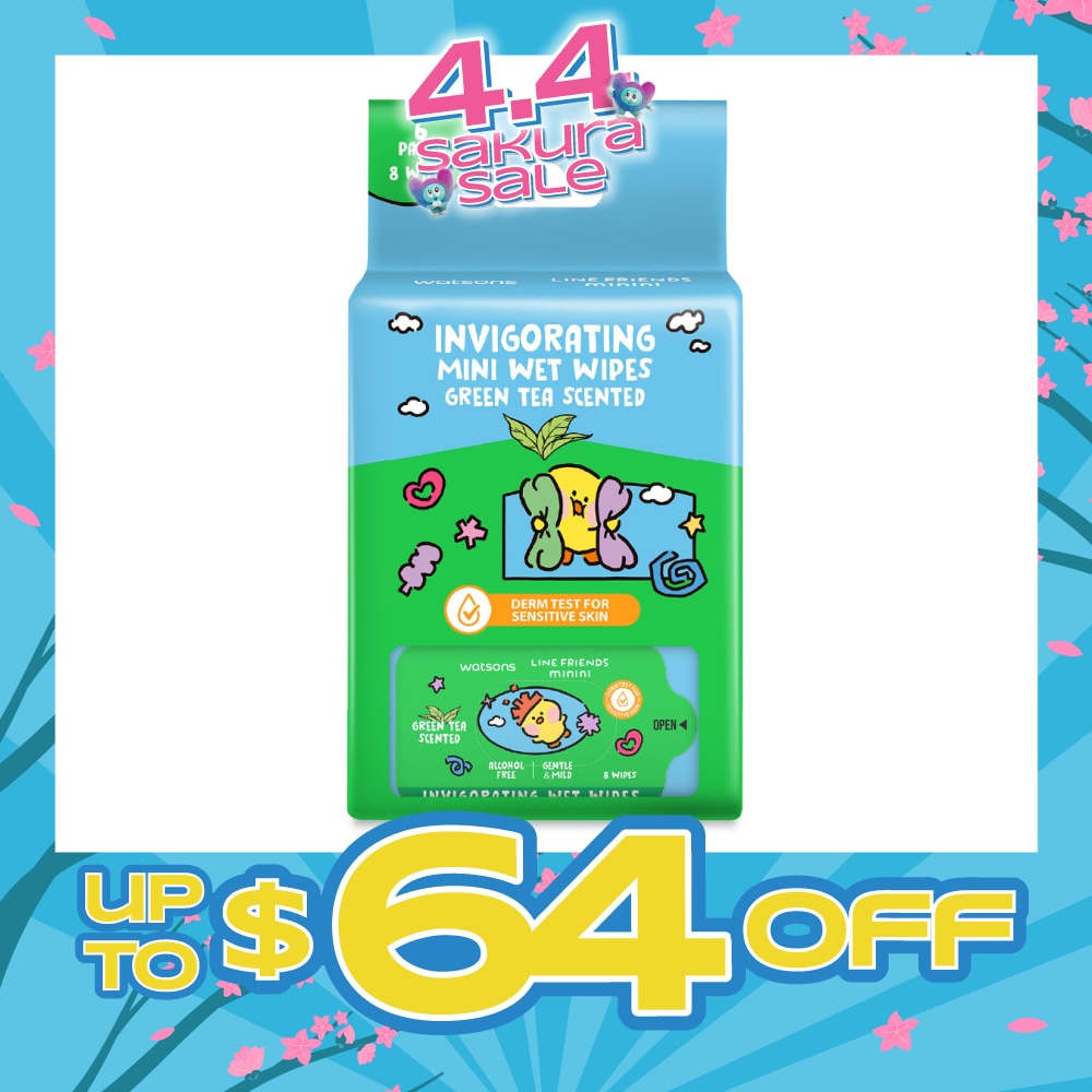 WATSONS Line Friends Minini Invigorating Mini Wet Wipes Green Tea Scented 8 x 6packs