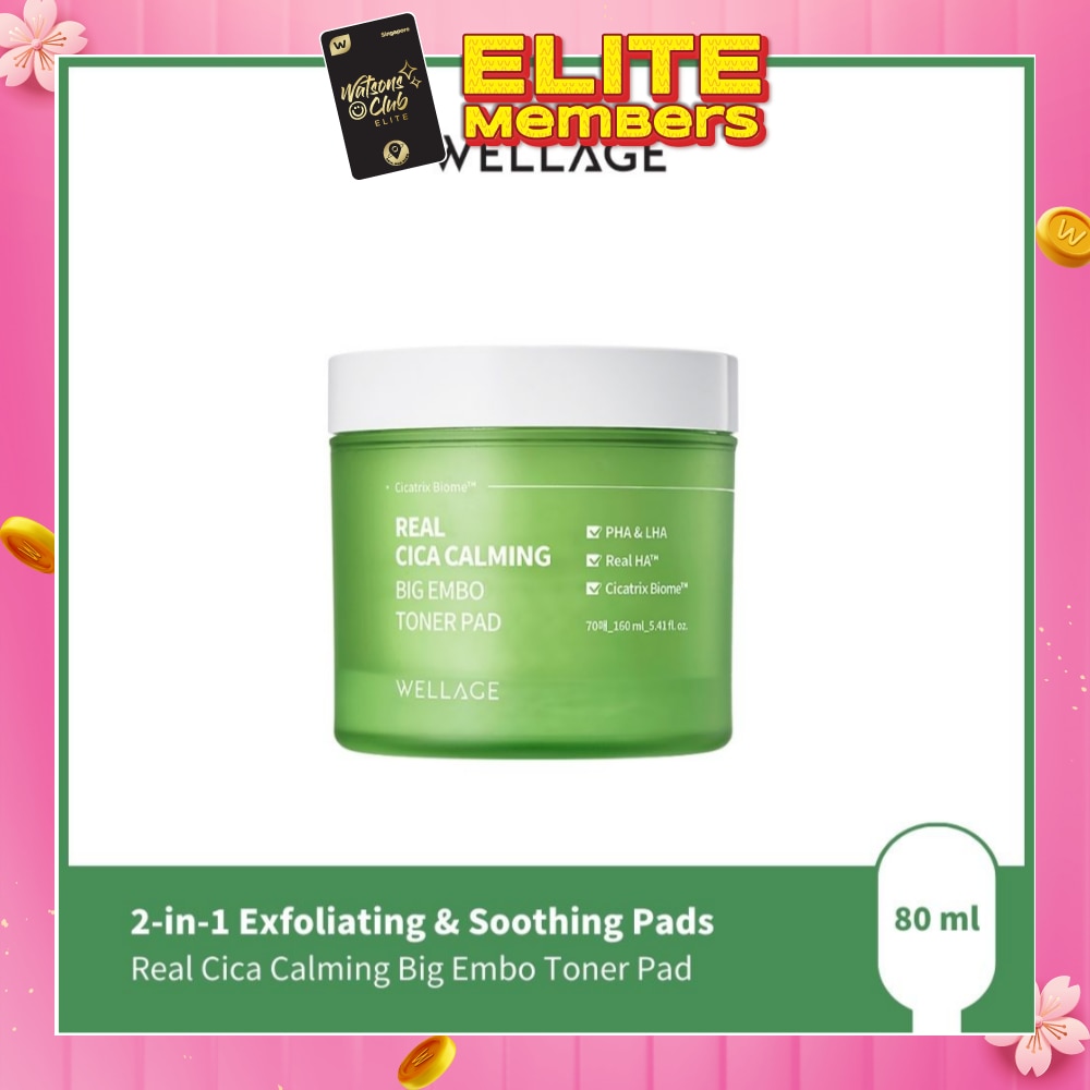 Soothe, exfoliate, and tighten pores in one step with Wellage Real Cica Calming Big Embo Toner Pads — designed for sensitive, acne-prone skin in need of targeted calming and texture refinement.